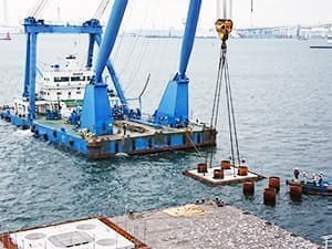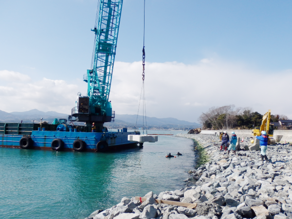| 工事概要 | 消波ブロック運搬工(陸上・海上運搬) 据付工(起重機船)他 |